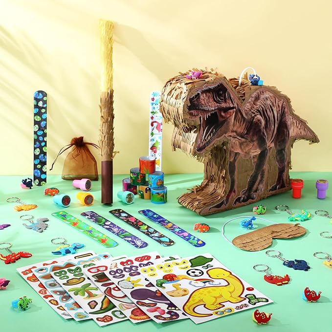 - Dinosaur Piñata Set: includes 1 piece of dinosaur piñata with 1 blindfold, 1 bat and 50g confetti; The set also includes 12 dinosaur slap bracelets, 12 sheets of DIY stickers, 12 dinosaur keychains, 12 dinosaur stamps, 12 dinosaur rings, 12 dinosaur gift bags, and 50 dinosaur stickers to keep boys and girls entertained