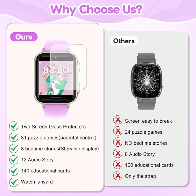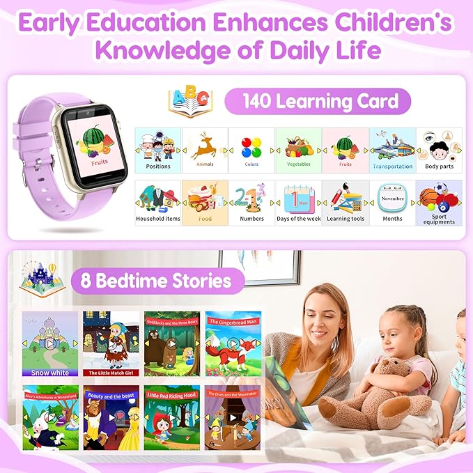 - 【Learning & Education Toys】As the newest upgrade watch for kids, introduces the newest habit tracking function, 12 audiobook stories, 8 picture stories and 140 learn cards, cultivating children's good habits and imagination.