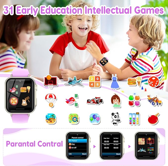 - 【30+ Puzzle Games】The smart watch for kids comes preloaded with 30+ puzzle games for ages 4-12 to keep them entertained and Exercise their brains at the same time. The newly added parent control mode allows for easy management and restriction of game time.