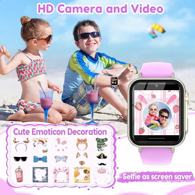 - 【Fun Selfie-Camera & Video】HD touchscreen kids watch supports camera and video, children can use cameras to record every happy moment in their lives, with pop big head sticker shooting, children can take some hilarious photos with family or friends, can easily save up to 10000+ photos.