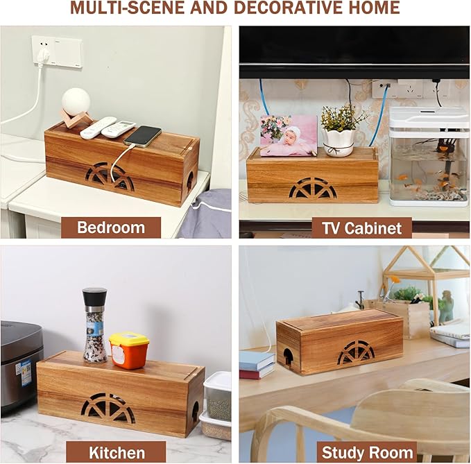 - Keep Kids and Pets More Safe: Our cable management box has a more secure and stable lid that won't fall off easily, using this acacia box to hide wires and cables will keep curious kids and pets away from all the cords for extra safety. Create an safe and aesthetically pleasing living space with our handcrafted wooden cable storage boxes.
