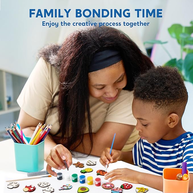 • Unique Design & Easy to Use: This 12-piece paint-your-own arts and crafts kit will spark your child's creativity. Kids will learn how to mix paints and express themselves by decorating wooden food magnets.
