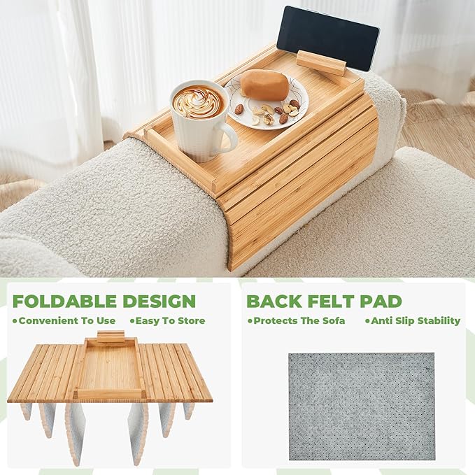 - IDEAL REPLACEMENT FOR COFFEE TABLES: Our sofa arm tray table is easy to use and does not require any assembly. The EVA non slip felt pad on the back of the couch tray not only sticks it tightly to the armrest of the sofa to keep it stable, prevent the drink from spilling and soiling the sofa, but also protect the sofa from injury. The sofa armrest tray can be the best gift for pregnant women, the elderly, parents, people with disabilities, and those working from home.