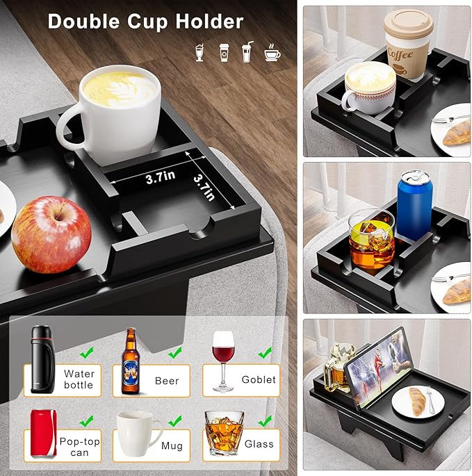 - 【2 in 1 Slide-Away Detachable Design】Couch Arm Table and Double Cup Holder Tray 2 in 1 slide-away detachable design Sofa Clip on Side Table for drink and telephone, remote control. After detaching the Double cup holder tray on the top can also be used as a computer tray table, coffee cup tray, end table tray, and food tray.