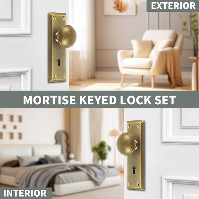 Mortise Lock Set for Interior Door, Vintage Antique Brass Door Knobs with Lock and Skeleton Key, Replacing Old Style Doors
