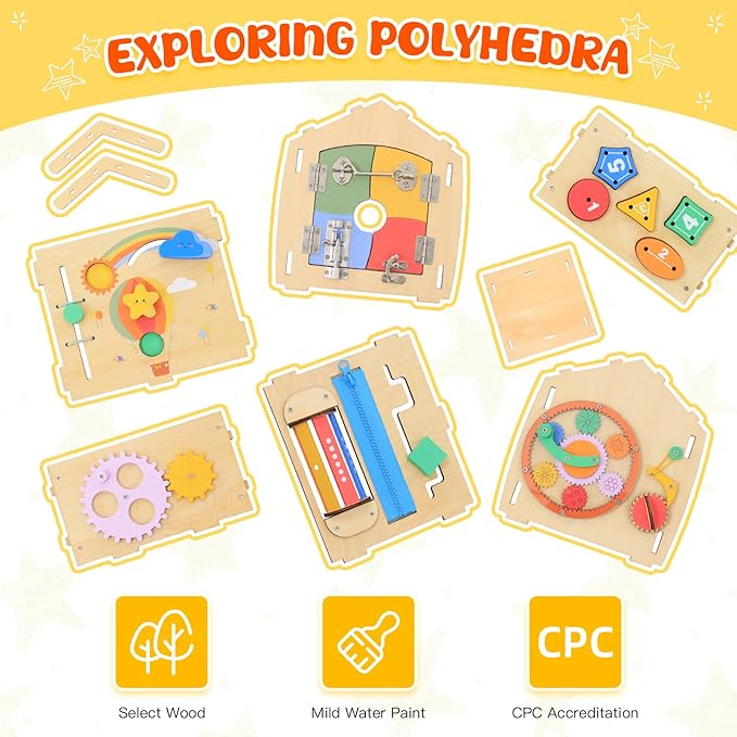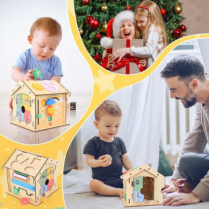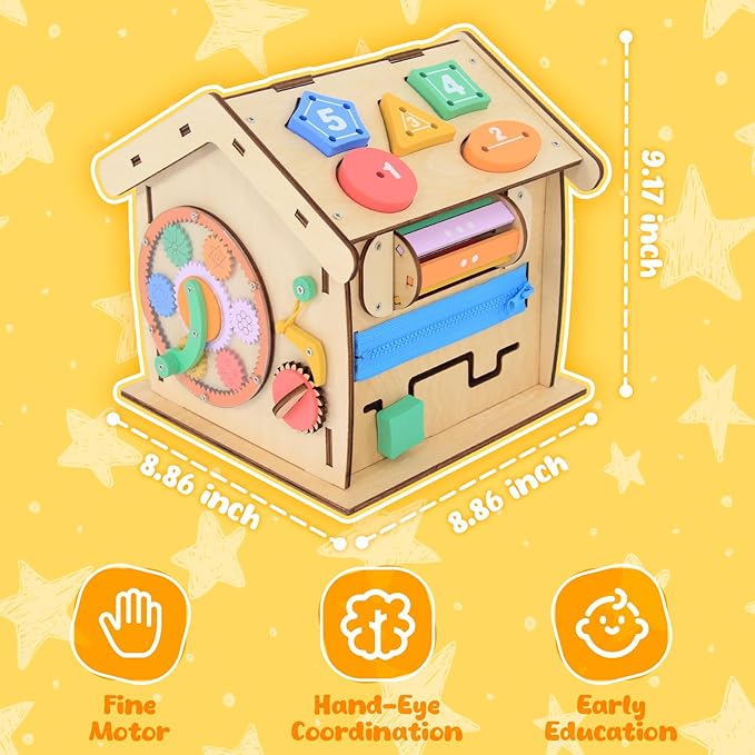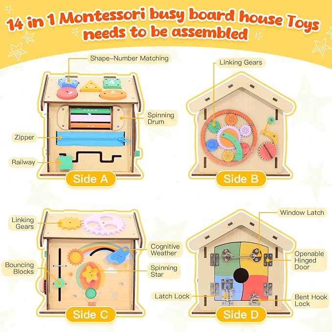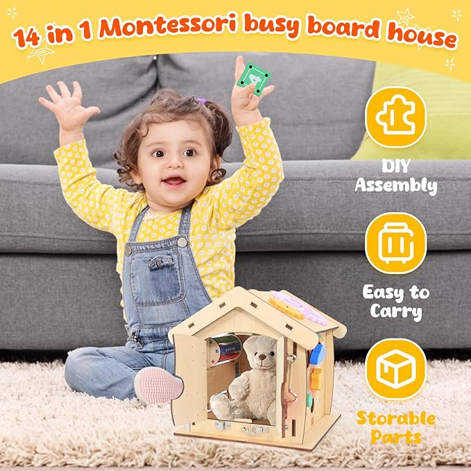 - INTERNAL STORAGE SPACE: montessori toys for 3 year old has plenty of storage space inside, baby can use it to store toys and develop the habit of organizing. Busy house, a sensory toys, Busy house is easy to assemble and convenient, the assembly takes 1-3 minutes, the assembly is completed to form a sufficient storage space.