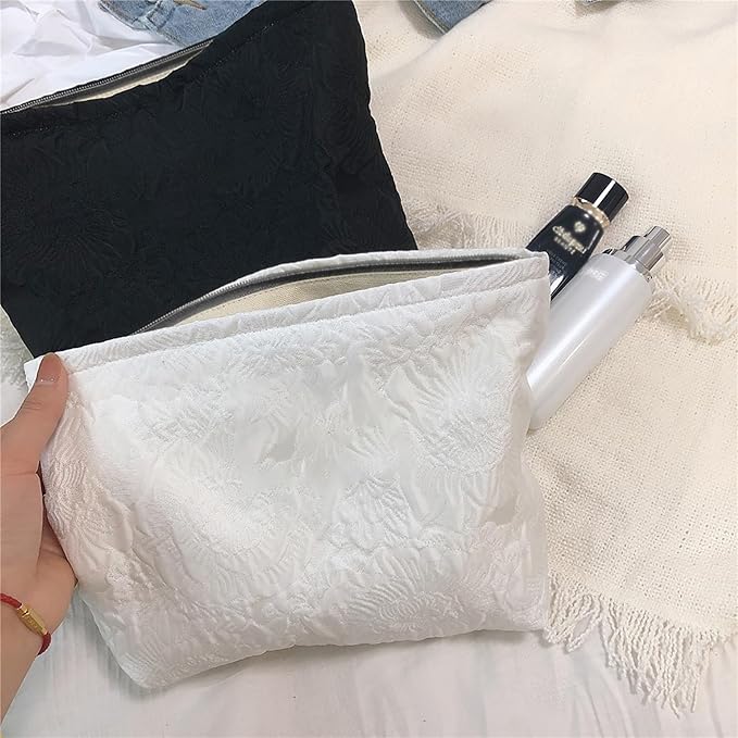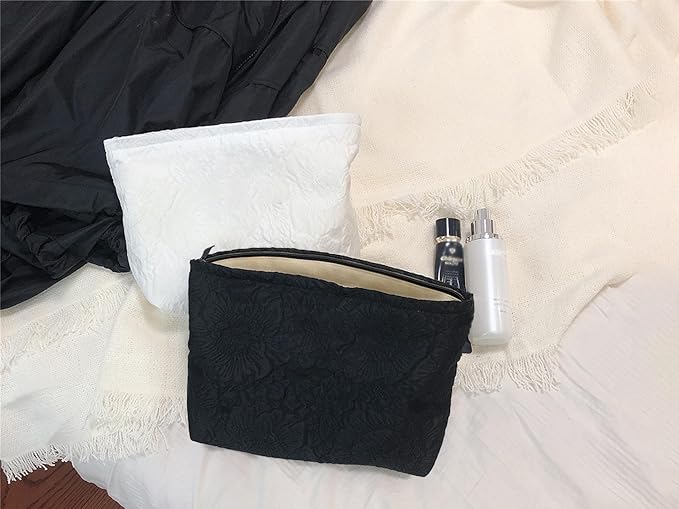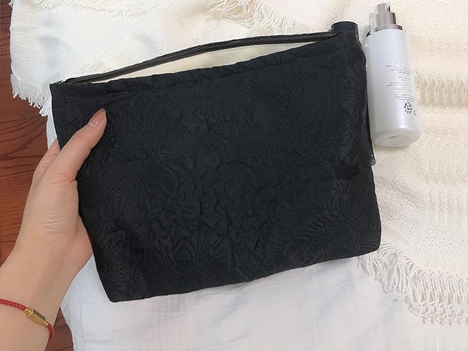 HAPPYHEIDI Large Floral Black Quilted Makeup Bag Cosmetic Toiletry Travel Pouch Purse Organizer, Canvas Lined, Embroiddered Flowers