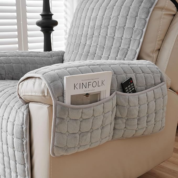 Quilted Recliner Chair Covers, Plush Non Slip Chair Slipcover Soft Washable Couch Cover Furniture Protector with Elastic Straps and Pocket for Kids, Dogs, Pets (Grey, 1 Seater)
