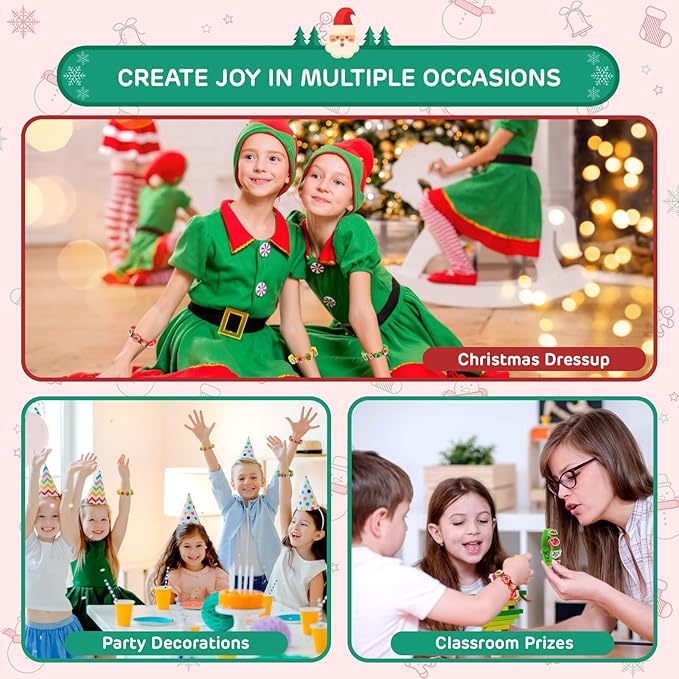 - Rich Accessories: Comes with 6 silicone bracelets featuring clasps for easy wear, plus 64 Christmas stickers and 64 decorations. With vibrant colors and diverse patterns, kids can unleash their creativity to design their own unique bracelets, adding joy and fun to any Christmas party