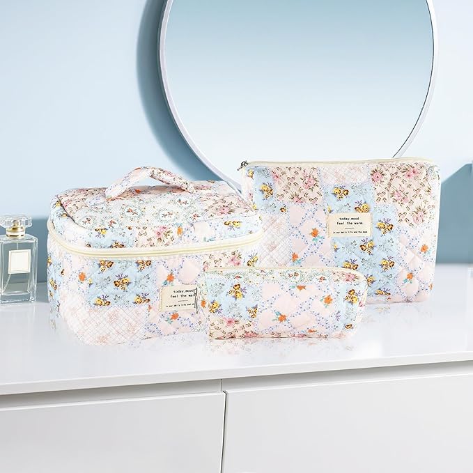- PERFECT SIZE AND LARGE CAPACITY: Our cute quilted makeup bag measures 9.9×6. 3×6.3 inches,10. 2×7. 1×2. 7 inches and 7. 48×3.14×2.36 inches, easy to carry. The cotton makeup bag is made of soft cotton and easy to clean. This smaller coquette aesthetic bag can also easy to store small items such as lipstick,eye shadow,eyebrow brush, etc. The larger spacious makeup organizer bag can store makeup brushes,skincare products,etc. The quilted makeup bag make your things organized and protected