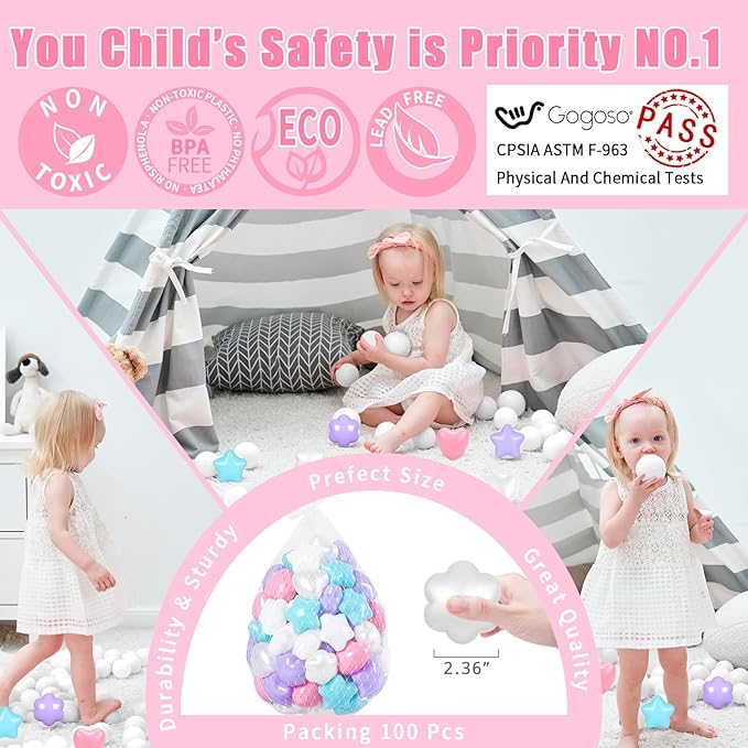 - Premium Quality: Our GOGOSO ball pits balls 100pcs stars and hearts are made made of phthalate-free, BPA-free, and non-toxic materials thicker and more durable materials, each ball capable of withstanding over 140 pounds of weight. Enjoy worry-free playtime!ensuring long-lasting fun for your kids play.