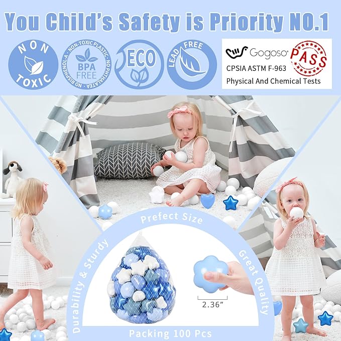 - Premium Quality: Our GOGOSO ball pits balls 100pcs stars and hearts are made made of phthalate-free, BPA-free, and non-toxic materials thicker and more durable materials, each ball capable of withstanding over 140 pounds of weight. Enjoy worry-free playtime!ensuring long-lasting fun for your kids play.