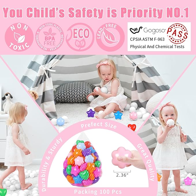 - Premium Quality: Our GOGOSO ball pits balls 100pcs stars and hearts are made made of phthalate-free, BPA-free, and non-toxic materials thicker and more durable materials, each ball capable of withstanding over 140 pounds of weight. Enjoy worry-free playtime!ensuring long-lasting fun for your kids play.
