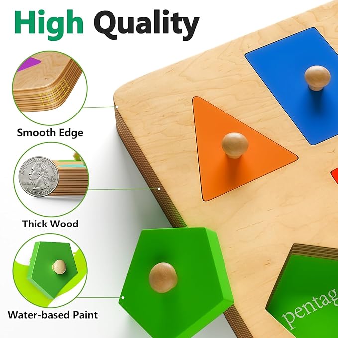 - WOODEN SHAPES PEG PUZZLES : EDUJOY Montessori toddler puzzle toy includes 6 fun shapes with 6 vibrant colors, including squares, circles, triangles, and more. These thick, colorful wooden pieces will easily attract children's attention and provide endless fun and learning opportunities!