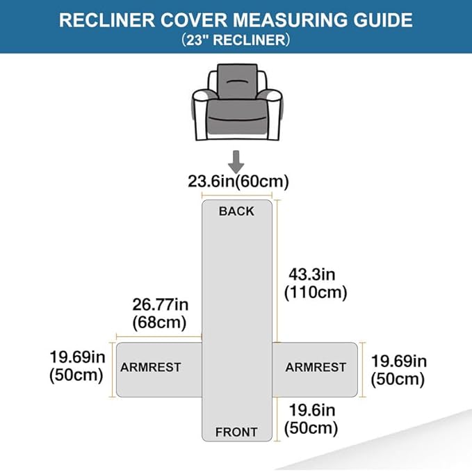 - 【Perfect for All Materials】Perfect fit for both leather and fabric recliners, providing your recliner with full protection from dust and daily wear and tear. Fits chairs with a seat width of 23 inches. Please measure your recliner before purchasing, refer to the measurement guide in the photo