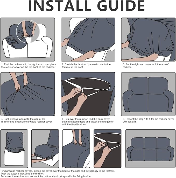 - EASY TO INSTALL: Our set of 8 recliner sofa covers includes 3 backrest cover, 3 footrest cover, and right and left arm covers. Effortlessly install in just a few minutes with the guide paper included in the package