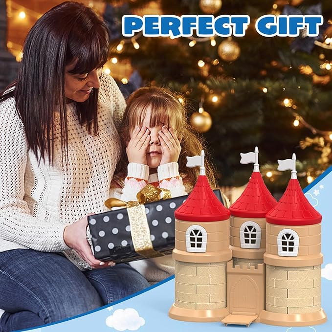- Castle Play Sand Kit: Dive into endless fun with our play sand kit, featuring 1.7 lbs of sensory sand, cute castle molds, a brick press, and 3 construction tools. Perfect for your little builders!