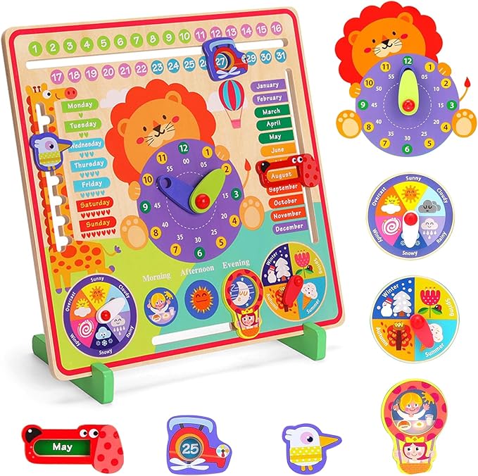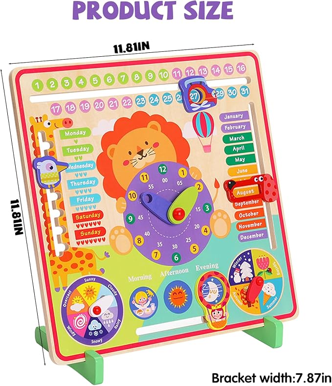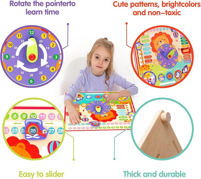 - ✔️【Convenient to Carry】: The kids wooden calendar and teaching clock is the perfect combination of games and education - No Assembly Required and does not take up much space, helping children learn about time, date and seasons in an interactive way, and develop a sense of weekly routines.