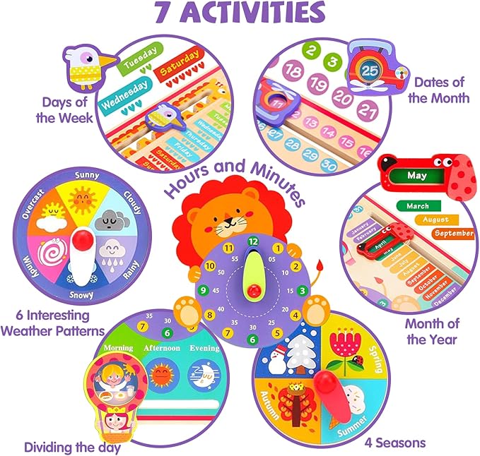 - ⏰【Wooden Calendar Board for Kids】: Kids can learn time, days of the week, dates, months of the year, weather and seasons by moving the sliders on the busy board to record their daily life. The clock for kids to learn time and understand the importance of punctuality-Better arrange a healthy daily routine.