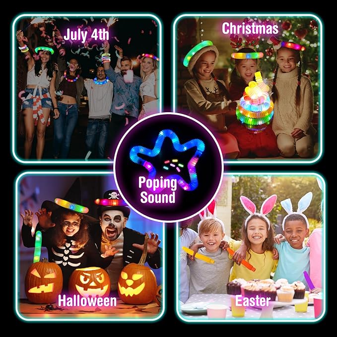 - 🌟Customizable Designs: The glow sticks are easy to bend and connect at the ends to create fun accessories like bracelets, necklaces, or even crowns. The LED pop tubes stretch, twist, and retract while making amusing sounds, adding even more fun to the mix. Together, these glow sticks and tubes are perfect for hands-on play and creating your own glowing accessories.