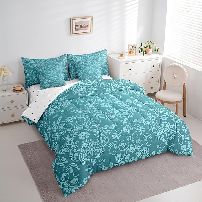 Feelyou Adults Teal Vintage Damask Floral Bedding Set Oriental Antique Comforter Set 7 Pieces Comforters Full Size Gothic Bohemia Boho FlowerBohemian Exotic Bed in a Bag