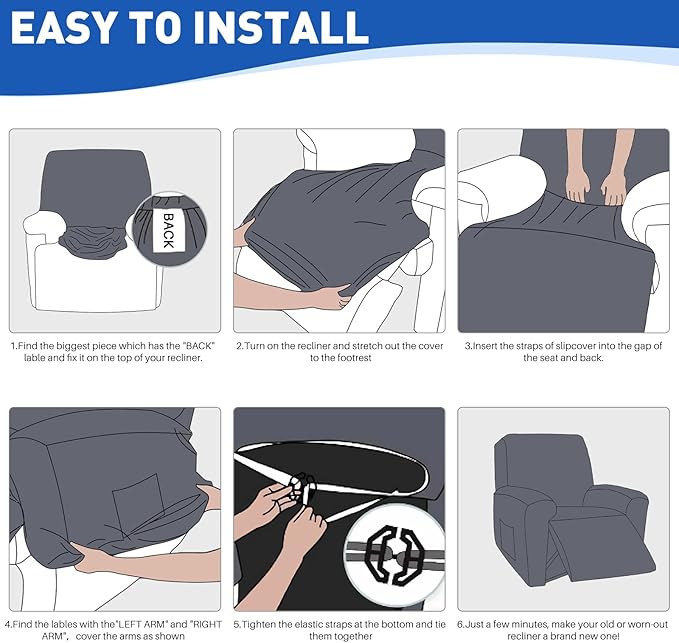- 【EASY TO INSTALL & CARE】Simply attach the recliner set cover parts to the corresponding parts of the recliner, then tighten and secure the straps, and you'll have a brand new reclining chair cover in just 8 minutes!! WASH TIPS: Machine or hand wash in cold water or below 30℃ water. Do not machine wash with the coating facing outwards. Do not bleach or iron. Hang drying is recommended