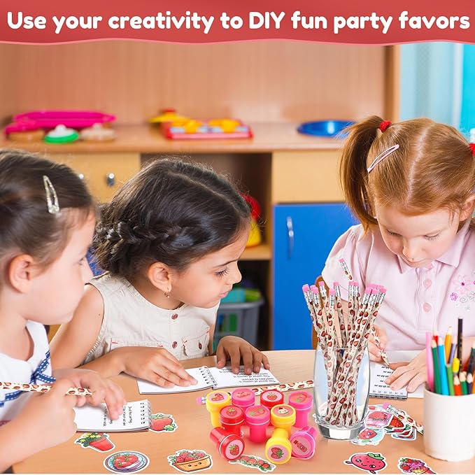 - Strawberry Party Supplies: you will receive 16 strawberry stampers, 16 strawberry keychains, 16 sheets of strawberry stickers, 16 strawberry mini sharpeners; 16 pencils, 16 erasers, 16 slap bracelets, 16 gift tags, 16 notepads, 16 cups with lids, 1 bag of twist ties, a total of 161 items, such a nice combination that can satisfy your various needs for a strawberry themed party