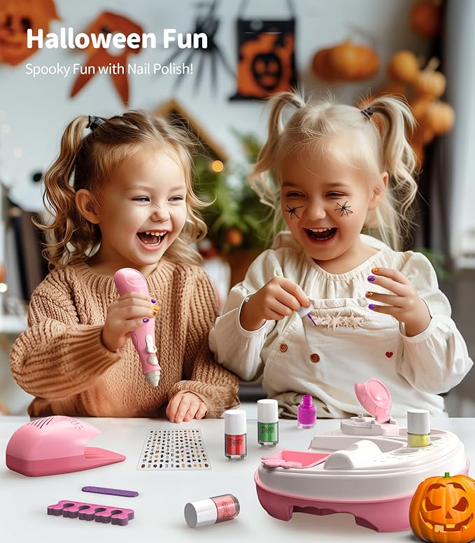 Geyiie Nail Polish Set Toys Nail Stickers, Nail Art Kits with Nail Dryer Glitter Pen for Girls, DIY Manicure Decoration Spooky Nail Decals Gifts
