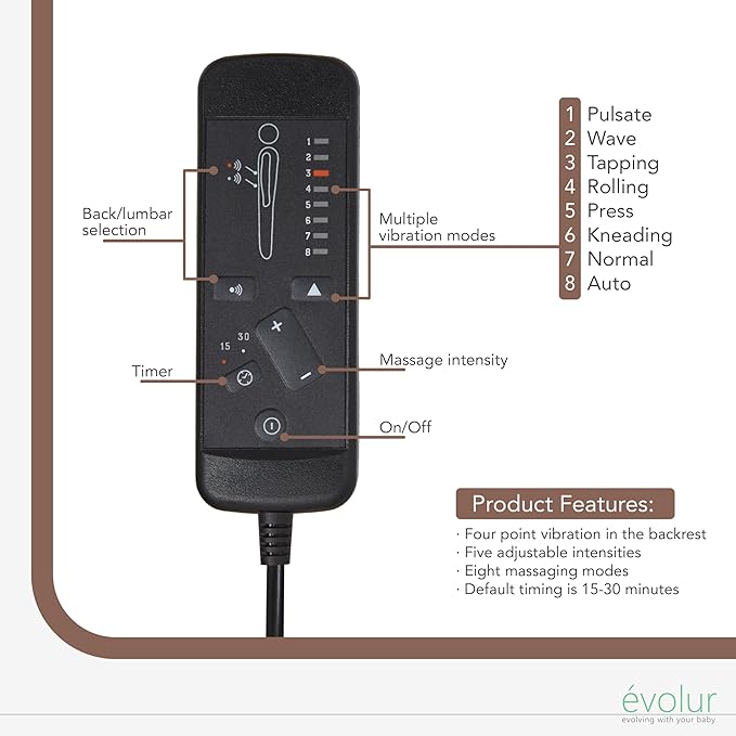 - STRONG & SAFE: The Evolur Harlow Glider With Massager is the 2022 JPMA Innovation Award winner. It is Greenguard Gold Certified, has a solid metal base, meets all CA TB117-2013 flammability requirements and has a 1-year Limited Manufacturer’s Warranty.