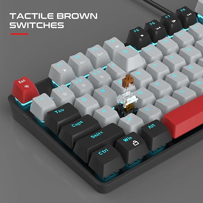 - MECHANICAL BROWN SWITCHES: The brown switch is in between the blue switch and the red switch, with moderate trigger key travel and trigger force. There is some sound when pressing the keys, but it is not as noticeable as the blue switch. It is responsive and has a slightly heavier feel than the red switch. It is suitable for both typing and gaming. Floating keys design, easy to clean the dust.