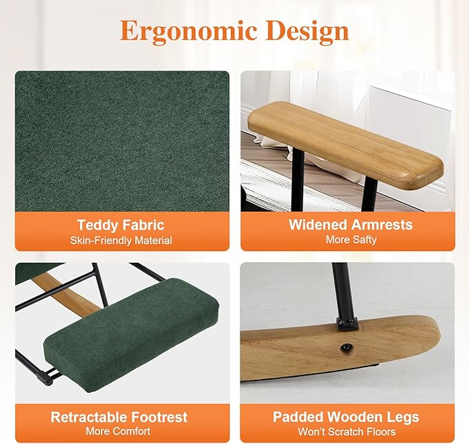 Rocking Chair with Footrest-Glider Rocker Chair with Retractable Footrest and Adjustable Backrest, Teddy Upholstered Rocking Chair, Modern Accent Chair for Living Room/Nursery/Bedroom/Outdoor-Green