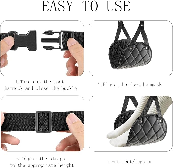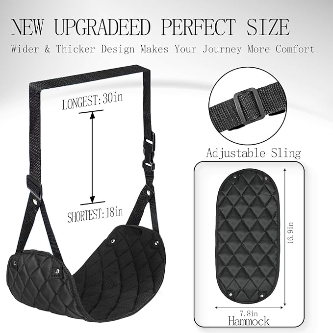 - Travel in Ultimate Comfort : Our foot hammock designed for airplane travel will offer your feet the relaxation they truly deserve, whether you're on a lengthy road trip or a long-haul flight. Our high-quality leg hammock for air travel improves blood circulation in your legs by elevating them, preventing stiffness or swelling!
