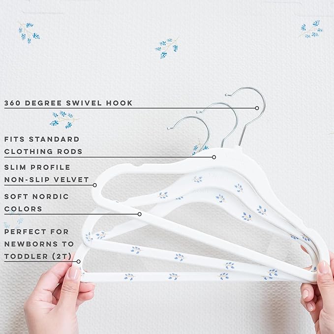 - ⭐️ 𝗦𝗧𝗬𝗟𝗜𝗦𝗛 𝗦𝗣𝗔𝗖𝗘 𝗦𝗔𝗩𝗘𝗥: Maximize closet space with the slim profile of 3 Sprouts Velvet Kids & Toddler Hangers, designed for easy organization and quick access to your little one's clothes; available in soft & modern nordic colors to effortlessly blend with your nursery décor, these hangers bring both style and functionality to reflect your baby's calm, gentle environment.
