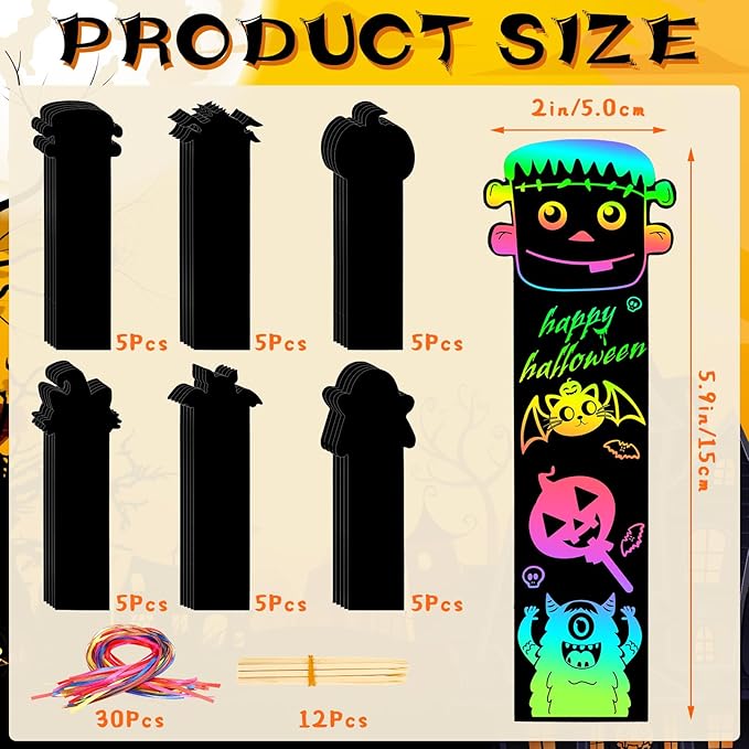 - Package Content: We provide 96 pieces Halloween scratch bookmarks kit, including 96 exquisite bookmarks (size 15 x 5 cm/6 x 2 inch), 96 colored ropes and 20 bamboo sticks. The Halloween scratch art will be an interesting party activity at your Halloween party, which is very helpful to improve eye-hand coordination, stimulate color recognition and enhance imagination