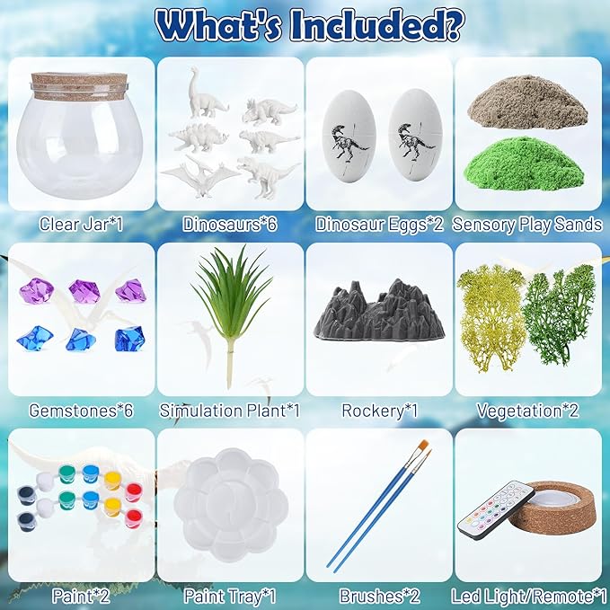 - 【DIY Dinosaur Terrarium Kit】Designed for dinosaur lovers,the unique diy dinosaur terrarium kit will inspire creativity and imagination.They can create their own dinosaur world by painting the included dinosaur toys with oil paint, depicting the dinosaurs in their mind and decorating the dinosaur terrarium with magic sand, rocks, preserved moss, artificial trees and 2 dinosaur eggs.These elements create a realistic and captivating scene and enhance overall DIY experience!