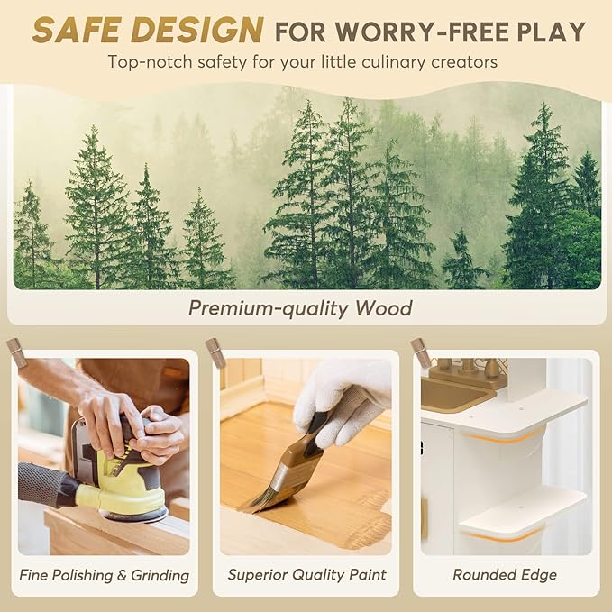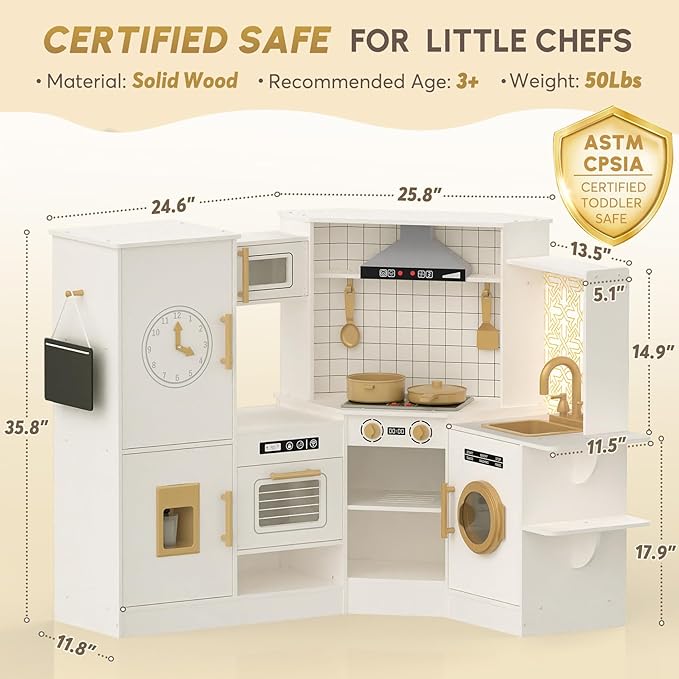 • Premium Coner Wooden Play Kitchen: BIERUM Play Kitchen is made from BPA-free, non-toxic wood that meets ASTM and CPSIA safety standards, ensuring it is both sturdy and safe to use. It measures 55 inches wide and 11.8 inches deep after assembly.