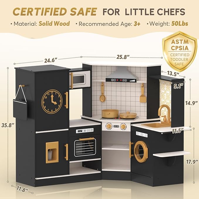 • Premium Coner Wooden Play Kitchen: BIERUM Play Kitchen is made from BPA-free, non-toxic wood that meets ASTM and CPSIA safety standards, ensuring it is both sturdy and safe to use. It measures 55 inches wide and 11.8 inches deep after assembly.