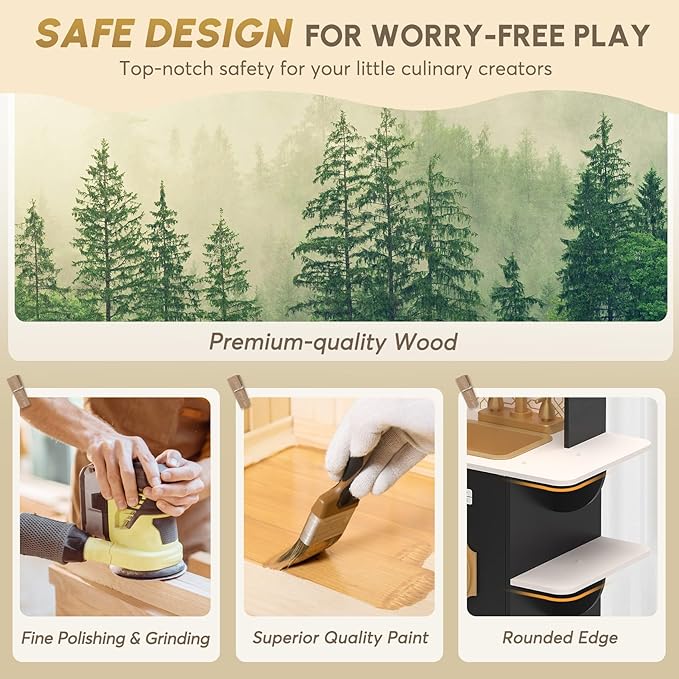 • Outstanding Safety Design: Safety is the number one priority for every product we make. This play kitchen is built with rounded corners to prevent bumps and injuries while your child explores the world of pretend cooking. Whether playing alone or with others, this is the top choice for your child.