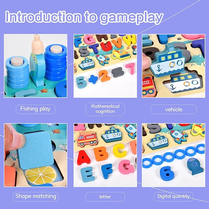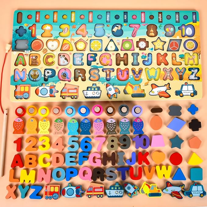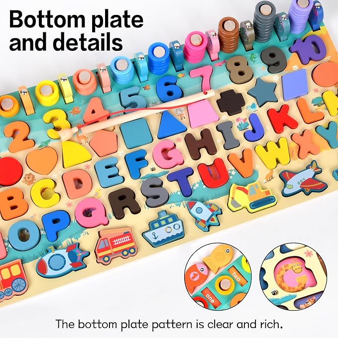 - The multi-functional fishing class is made of natural wood and covered with non-toxic water-based paint. The smooth surface of the board has been carefully polished, and the large-sized figures are made for the safety of small researchers, are guaranteed safe toys and perfect puzzle toys for play and learning. Color pictures and the classification of inserted different colors and numbers help to distinguish colors, geometric shapes, and develop fine motor skills.