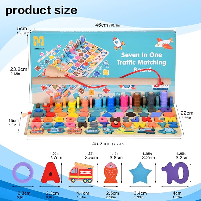 - This shape number fishing game board, which has interesting animals and animal images, colorful cars, small fruits, develops young children's color, shape, number recognition, hand-eye coordination, encourages creativity and imagination, fine motor skills, math counting skills, and is an ideal toy for young children's preschool learning.