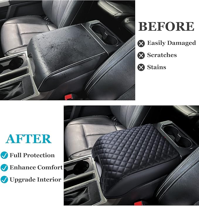 - EXQUISITE WORKMANSHIP -- Our Ford F150 center console cover adopts advanced stitching technology to sew the classic diamond pattern, which makes your car’s armrest box look luxury. The black PU leather cover is like an OEM part that matches perfectly with your car interior, and raises the look of the cab to another level