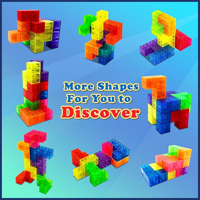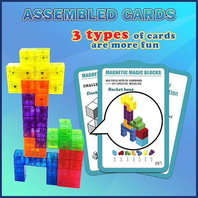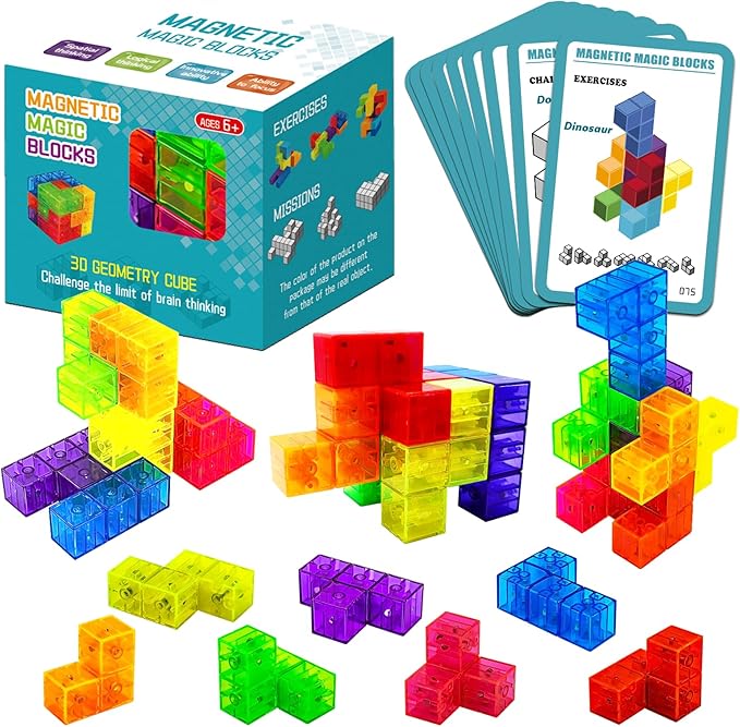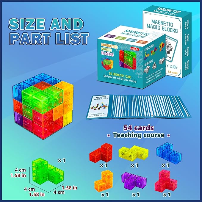 - 【Magic magnetic 3D cubes】7 pcs 3D magnetic building blocks comes with 54 puzzle cards, the built-in magnet allows you to assemble freely the cubes into any shapes such as lion, goose, dogs, rocket, camel or any other object