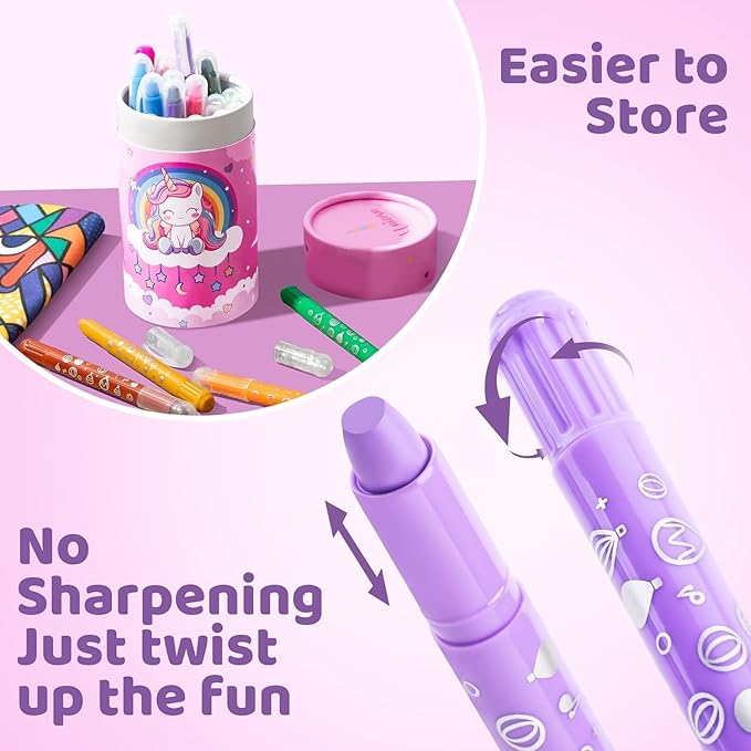 - Twistable Crayons:This kids coloring set includes 24 twistable crayons, perfectly designed for little hands.Unlike traditional crayons, these require no peeling or sharpening, making them a mess-free option for coloring. Plus, the sturdy case provides added protection, ensuring the crayons stay safe from breaking, so your child can unleash their creativity without worry!