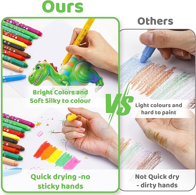 - Silky and Washable Cryons: Our crayons offer a silky-smooth application that glides effortlessly across the paper, ensuring vibrant, rich colors with every stroke.Plus, they’re washable, making clean-up quick and easy—perfect for stress-free creativity!