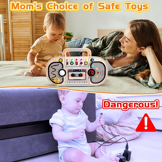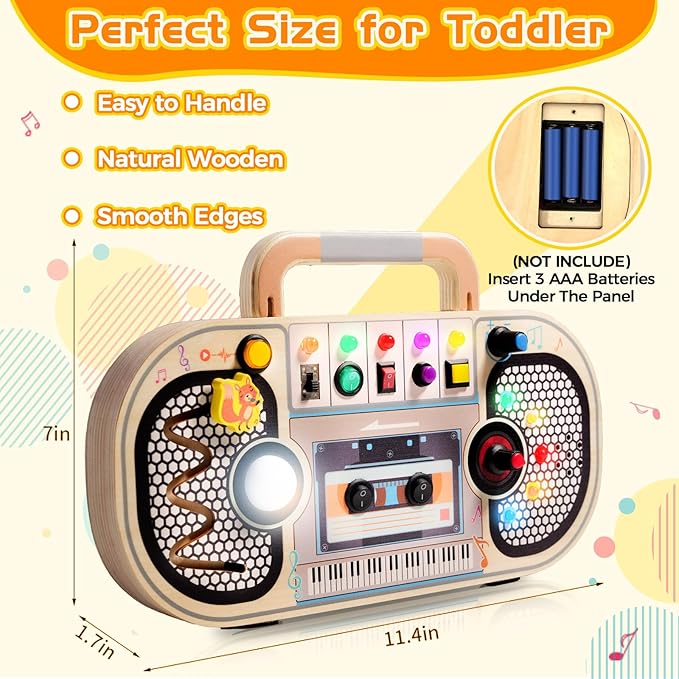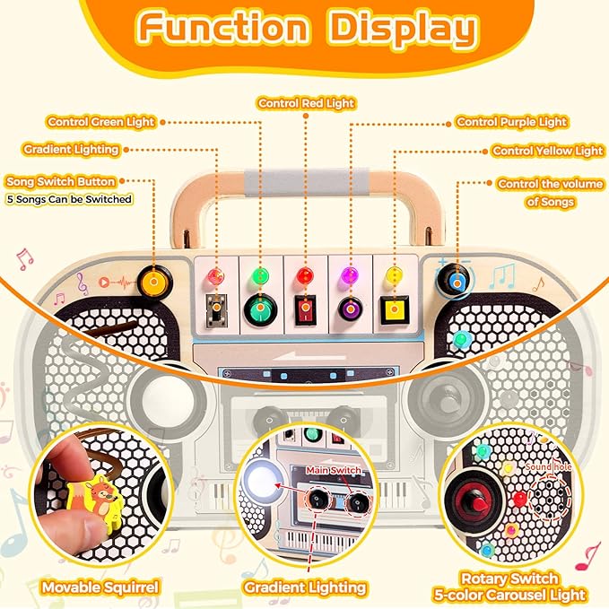 - Busy Board with Music: Cartoon busy board toy is designed with 5 songs and a volume adjustment control panel. The round yellow buttons change songs and help children learn to manipulate everyday objects while developing their fine motor skills