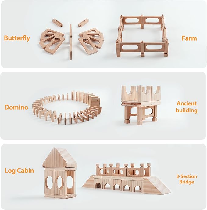 - VERSATILE EDUCATION TOY -Our learning toys come with 1 instruction manual and 6 interactive cards that'll spark kids' imagination! Little artists can make different designs by referring to the cards, such as ranches, log cabins, butterflies and others. These toddler toys can be dominoes, traditional building blocks, or even a full arch bridge. Children can create a variety of 2D planar and 3D geometric shapes, relishing the sense of achievement as they turn imaginations into reality