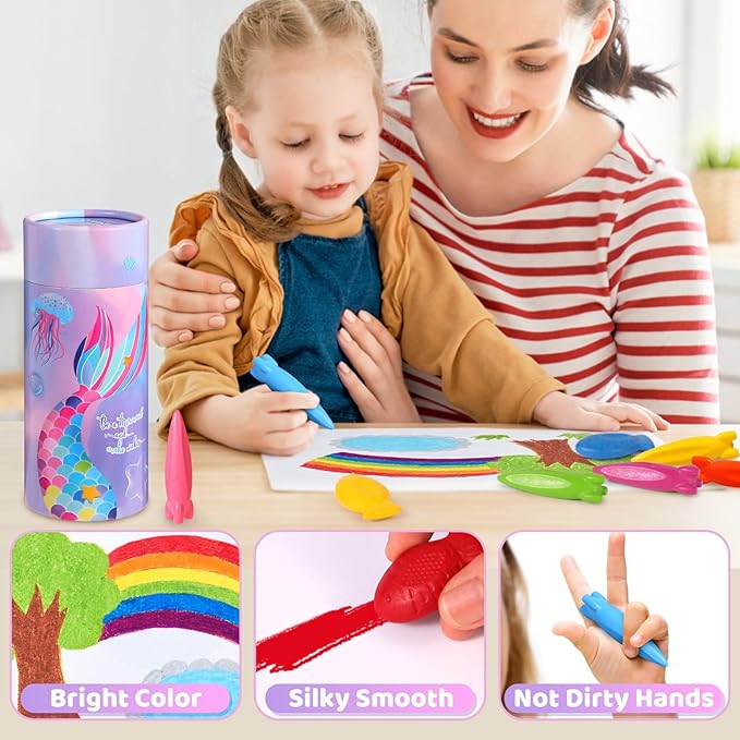 - Non-toxic Crayons for Toddlers and Kids:these crayons are completely free from harmful chemicals like asbestos, lead, and phthalates.Ideal for toddlers and kids,the crayons set are gentle on delicate skin and offer a safe,mess-free coloring experience.Whether it's drawing on paper or adding colorful designs to face painting, these coloring crayons bring out your kid's creativity—plus, they come neatly stored in a mermaid pencil holder for easy access and organization. Perfect for little hands!