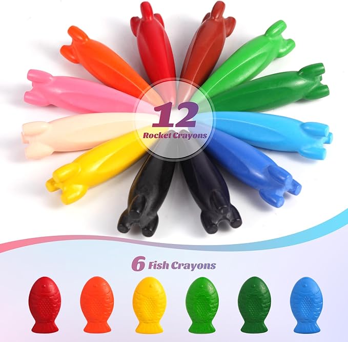 DreamCandy Rocket and Fish-Shaped Crayons,18PCS Non Toxic Washable Toddler Crayons for Kids and Toddlers,Art Supplies Drawing Coloring Crayon Set,Gift for Girls and Boys,Back to School