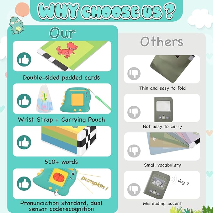- Toddler Flash Cards: Equipped with a 300mAh rechargeable battery, this speech therapy toys can be used continuously for over 12 hours on a single charge. If not used for 3 minutes, it automatically enters standby mode, with a standby time of up to 6 months, ensuring you can use it anytime, anywhere