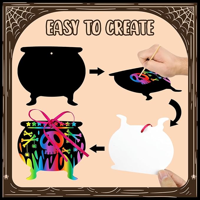 - Safty Materials: The Halloween scratch art paper is made of safe, non-toxic, eco-friendly paper with a black coating on the surface. Scrape a favorite pattern onto the black coating with a small wooden stick and secure it with ribbon through the pre-drilled holes in the card for a Halloween colorful paper ornaments.
